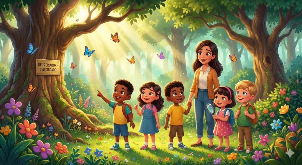 Este artigo explora como pais e professores podem ensinar crianças de 4 a 11 anos sobre o Deus criador e seu cuidado constante através da natureza. Inclui atividades práticas, sugestões por faixa etária e uma visão bíblica humanizada sobre a providência divina.