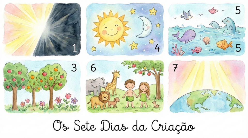 Explore a beleza de os 7 dias da criação com este guia prático para pais e professores. Inclui atividades adaptadas para crianças de 4 a 11 anos, tabela resumo e dicas para ensinar a narrativa bíblica de Gênesis de forma envolvente e espiritual.