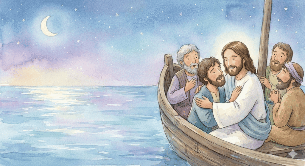 Uma adaptação lúdica e afetuosa da passagem bíblica onde Jesus acalma a tempestade, focada em ensinar o valor da confiança em Deus para crianças pequenas.